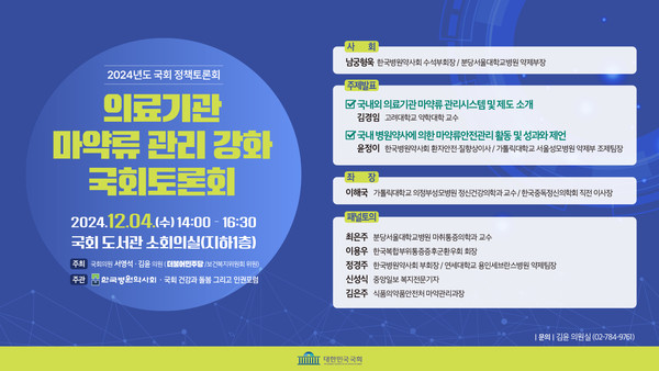 한국병원약사회(회장 김정태, 이하 병원약사회)는 오는 12월 4일 오후 2시 국회 도서관 소회의실에서 ‘2024 국회 정책토론회’를 개최한다. 국회 보건복지위원회 서영석·김윤 의원이 주최하고 한국병원약사회와 ‘국회 건강과 돌봄 그리고 인권포럼’이 주관하는 이번 정책토론회는 정부와 보건의료계, 언론 등이 모여 ‘의료기관 마약류 관리 강화’를 주제로 다각적인 논의를 나눌 예정이다.