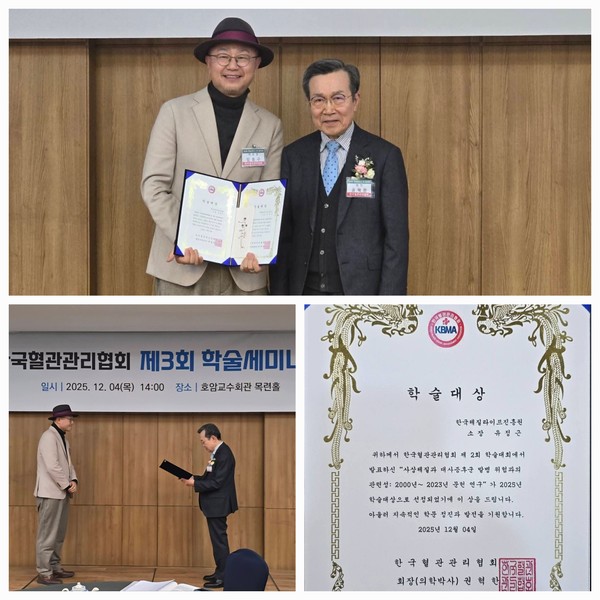사상체질 전문가 임동구박사<사진,왼쪽>가 지난 4일 호암교수회관에서 열린 2025년 한국혈관관리협회 제 3회 학술대회에서 '사상체질과 대사증후군 발병위험과의 관련성 :2000-2023년 문헌연구'가 2025년 학술대상을 받았다.